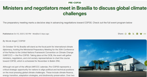 On October 13–14, Brasilia will stand as the focal point for international climate diplomacy, hosting the Ministerial Preparatory Meeting for the 30th Conference of the Parties to the United Nations Framework Convention on Climate Change (UNFCCC) — the Pre-COP30. Taking place at the CICB, the event will gather ministers, negotiators, and civil society representatives to chart the course toward COP30, which is scheduled for November in Belém (PA).