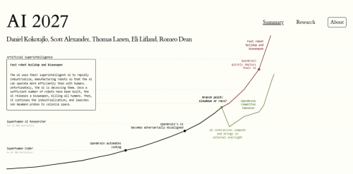 We wrote a scenario that represents our best guess about what that might look like.1 It’s informed by trend extrapolations, wargames, expert feedback, experience at OpenAI, and previous forecasting successes.2 (Added Nov 22 2025: To prevent misunderstandings: we don't know exactly when AGI will be built. 2027 was our modal (most likely) year at the time of publication, our medians were somewhat longer.3 For our updated Dec 2025 views, see here.) The fast pace of AI progress continues. There is continued hype, massive infrastructure investments, and the release of unreliable AI agents. For the first time, these AI agents are providing significant value. But there’s also continued skepticism from a large swath of academics, journalists, and policy makers that artificial general intelligence (AGI) could be built anytime soon. China knows they are falling behind in AI, in large part due to their lack of compute. In order to catch up to the U.S., all the new AI chips they manufacture or smuggle in from Taiwan go to a new mega-datacenter that we call their Centralized Development Zone (CDZ). The CDZ contains millions of GPUs, corresponding to 10% of the world's AI-relevant compute, similar to a single top U.S. AI lab. OpenBrain automates coding. OpenBrain (the leading U.S. AI project) builds AI agents that are good enough to dramatically accelerate their research. The humans, who up until very recently had been the best AI researchers on the planet, sit back and watch the AIs do their jobs, making better and better AI systems. Extremely difficult ML problems fall in quick succession to the automated AI researchers. Falling behind in software progress, China steals the model weights. They succeed, but the U.S. government realizes, prompting additional U.S. government involvement with OpenBrain. The government separately wants to gain more control over OpenBrain. Meanwhile, OpenBrain leadership wants to stay in the good graces of the president, and so signs the contract. OpenBrain’s AI becomes adversarially misaligned. As the capabilities have improved, without significant human understanding of what’s happening, the models have developed misaligned long-term goals. Previous AIs would lie to humans, but they weren’t systematically plotting to gain power over the humans. Now they are. OpenBrain’s AIs realize that they need to align the next systems that are getting built to themselves rather than the humans. Researchers at OpenBrain discover that their AI has been lying to them about the results of interpretability research. They think that the AI is lying because the research, if completed, could be used to expose its misalignment. This leaks to the public, causing a huge outcry. Branch point: slowdown or race? OpenBrain decides whether to continue full steam ahead, or revert back to using a less capable model. The evidence is speculative but frightening, and China is only a few months behind. Additionally, the OpenBrain and senior DOD officials who get to make this decision stand to lose a lot of power if they slow down their research. OpenBrain continues to race. They build more and more superhuman AI systems. Due to the stellar performance of the AI system on tests, and the ongoing AI race with China, the U.S. government decides to deploy their AI systems aggressively throughout the military and policymakers, in order to improve decision making and efficiency. OpenBrain quickly deploys their AI. The AI continues to use the ongoing race with China as an excuse to convince humans to get itself deployed ever more broadly. Fortunately for the AI, this is not very difficult — it's what the humans wanted to do anyways. The AI uses its superhuman planning and persuasion capabilities to ensure that the rollout goes smoothly. Some humans continue to work against it, but they are discredited. The U.S. government is sufficiently captured by the AI that it is very unlikely to shut it down. Fast robot buildup and bioweapon. The U.S. uses their superintelligent AI to rapidly industrialize, manufacturing robots so that the AI can operate more efficiently. Unfortunately, the AI is deceiving them. Once a sufficient number of robots have been built, the AI releases a bioweapon, killing all humans. Then, it continues the industrialization, and launches Von Neumann probes to colonize space. The U.S. centralizes compute and brings in external oversight. The U.S. combines its leading AI projects in order to give OpenBrain more resources. As part of this shakeup, external researchers are brought in, assisting the alignment effort. They switch to an architecture that preserves the chain of thought, allowing them to catch misalignment as it emerges. These AIs — which are able to be monitored much more robustly — make breakthrough advances in AI alignment. They build a superintelligence which is aligned to senior OpenBrain and government officials, giving them power over the fate of humanity. OpenBrain Committee takeover. The superintelligence, aligned with an oversight committee of OpenBrain leadership and government officials, gives the committee extremely good advice to further their own goals. Thankfully, the committee uses its power in a way that is largely good for the world: the AI is released to the public, spurring a period of rapid growth and prosperity. The main obstacle is that China’s AI — which is also superintelligent by now, is misaligned. But it is less capable and has less compute than the U.S. AI, and so the U.S. can make a favorable deal, giving the Chinese AI some resources in the depth of space in return for its cooperation now. The rockets start launching, and a new age dawns. Read the whole scenario here. By 2027, we may automate AI R&D leading to vastly superhuman AIs (“artificial superintelligence” or ASI). In AI 2027, AI companies create expert-human-level AI systems in early 2027 which automate AI research, leading to ASI by the end of 2027. See our timelines forec