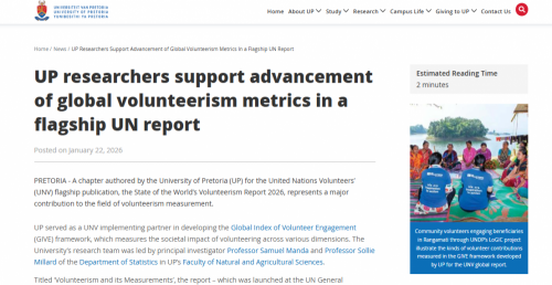 UP served as a UNV implementing partner in developing the Global Index of Volunteer Engagement (GIVE) framework, which measures the societal impact of volunteering across various dimensions. The University’s research team was led by principal investigator Professor Samuel Manda and Professor Sollie Millard of the Department of Statistics in UP’s Faculty of Natural and Agricultural Sciences.